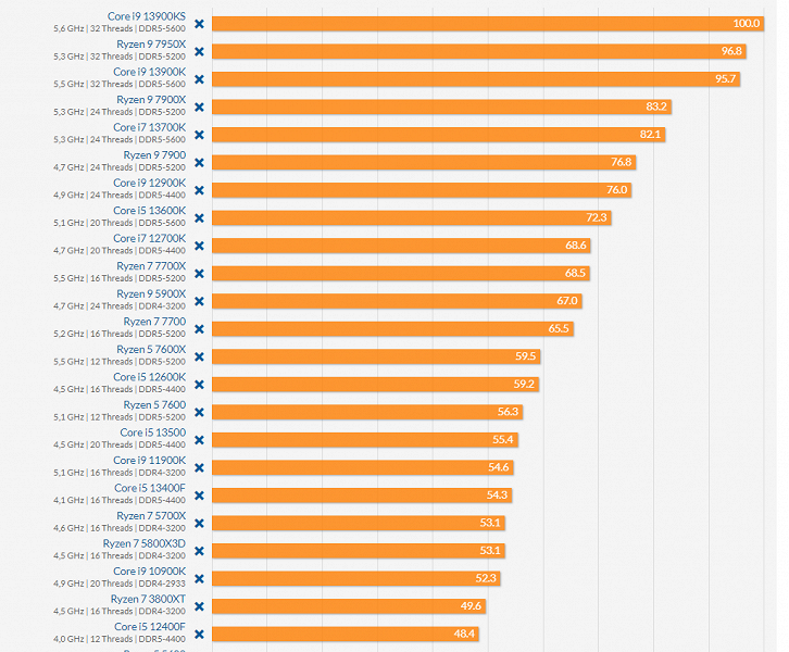 Как можно видеть, этот рейтинг возглавляет Core i9-13900KS, но Core i9-13900K и Ryzen 9 7950X очень близки к нему. В целом можно говорить, что эти три CPU практически идентичны, хотя, как и всегда, лучше смотреть по интересующим конкретного пользователя приложениям. Ryzen 9 7900X идёт вровень с Core i7-13700K, Ryzen 9 7900 конкурирует с Core i9-12900K, Ryzen 7 7700X несколько уступает Core i5-13600K и конкурирует с Core i7-12700K, Ryzen 7 7700 в целом находится почти на том же уровне, а младшие Ryzen 5 7600/7600X выступают на уровне Core i5-12600K и Core i5-13500.