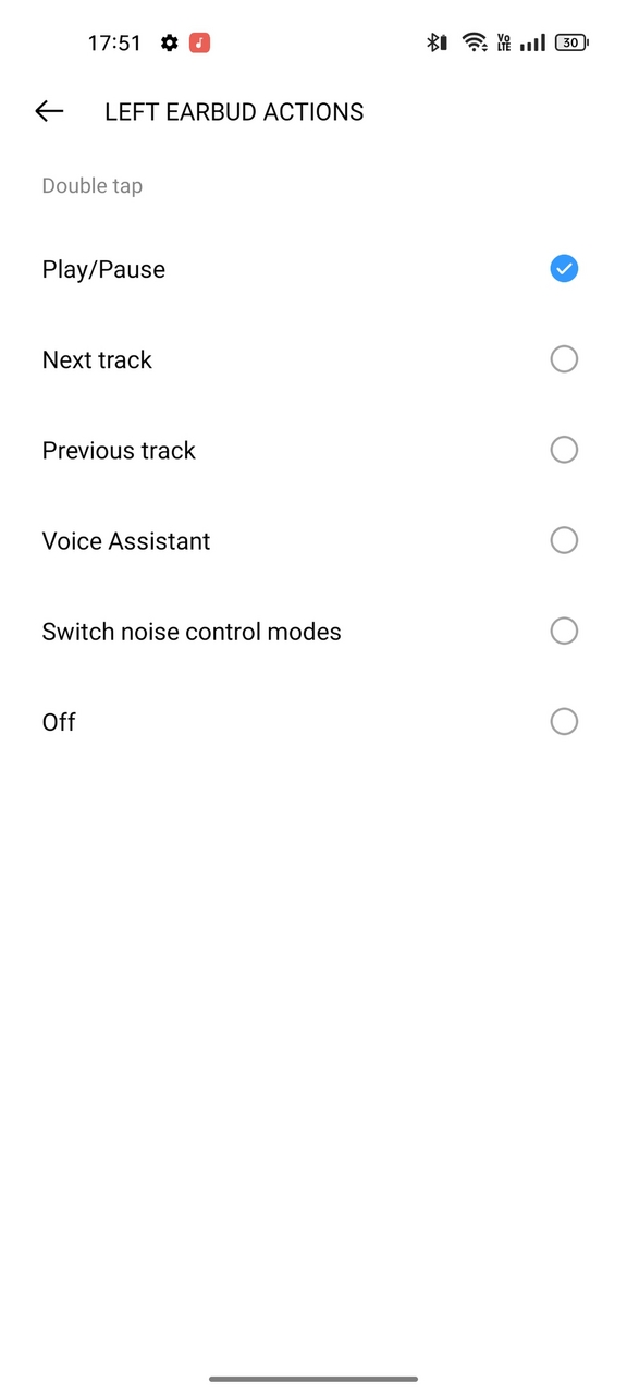 When the earphone device is connected to realme Link, click the device name to enter the settings page. You can customize the touch function settings for any earphone, as shown in the figure below. Moreover, when the phone is only connected to a single earphone, the settings for a single earphone can also be performed. If the earphone is not connected, the settings cannot be performed.